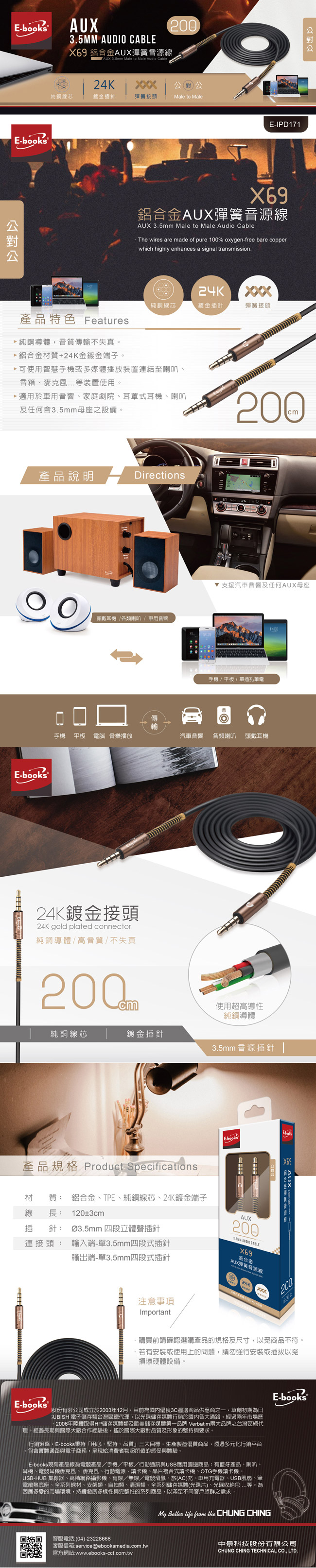 E Books 3c品牌館x69 鋁合金aux彈簧音源線公對公3 5mm 0cm E Books 3c 品牌館