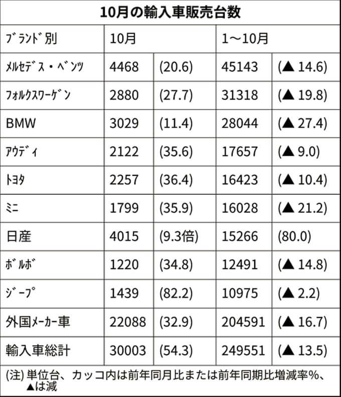 10月の輸入車販売 13カ月ぶり前年上回る 日本経済新聞